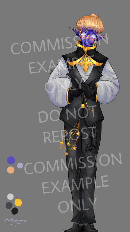 (I greatly prefer to be given a visual reference of some kind, and I can work together with you to find some! References don’t have to be 100% accurate — just something that gives me a general idea of what you’re looking for, and I can work with you for a design you’re happy with from there. Existing art of the OC, picrews, inspiration from Pinterest, etc. all work perfectly fine.)